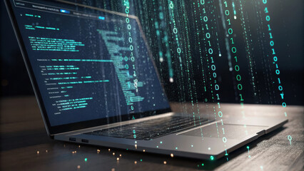 laptop displaying code on its screen is surrounded by cascading binary rain, symbolizing digital data flow and programming