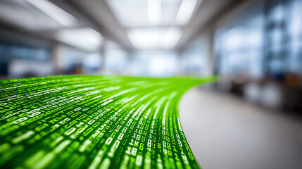 Abstract digital flow of green binary code in a modern office environment, symbolizing data and innovation.