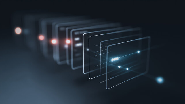 Abstract digital layers, representing data visualization and information processing, glow with an ethereal luminescence against a dark backdrop, creating a sense of technological advancement.