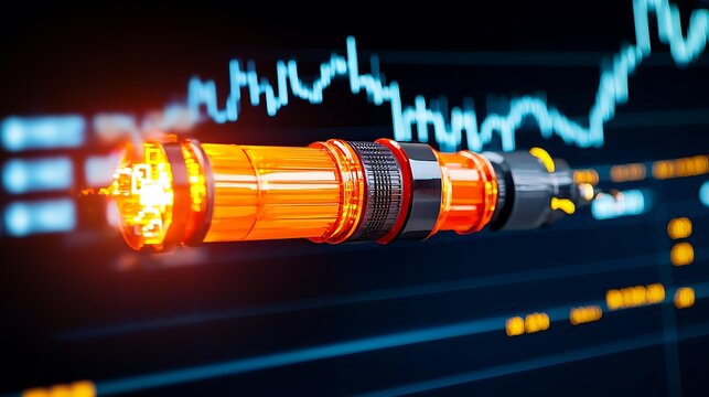 Orange device on a screen with a chart depicting market fluctuations in a futuristic setting
