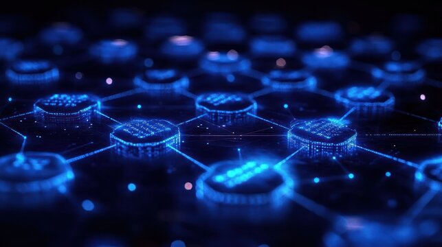 glowing blue interconnected digital nodes and token-like discs on a futuristic network grid, evoking high-tech connectivity and secure data flow