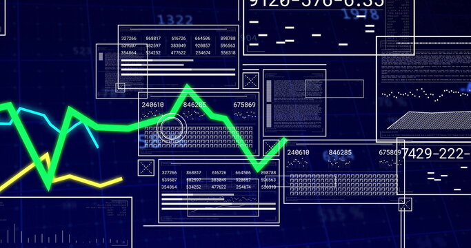 Tracing green line graph on trading monitor, with yellow graph blue grid overlay and numeric data