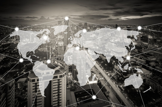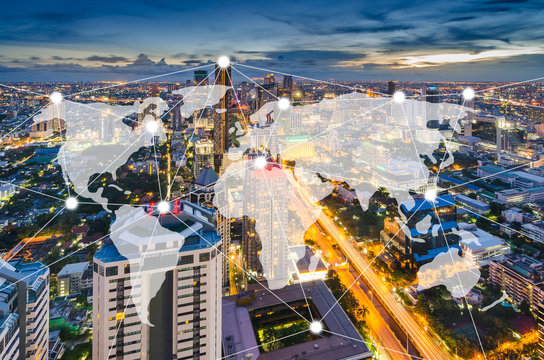 Hologram of Earth planet map on billboard over night panoramic cityscape of Bangkok. The concept of international companies in Southeast Asia.