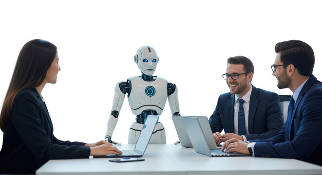 A diverse group of professionals collaborates around a meeting table, focusing on teamwork and AI technology, illustrating innovation and effective communication in a modern workspace. Trope
