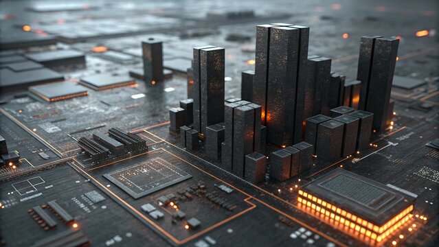 Cityscape on a microchip board shows technology innovation and the integration of urban life with technological advancement.
