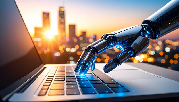 Human interaction with ai  typing on laptop amidst holographic graphics in urban landscape