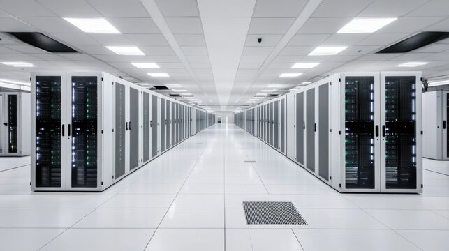 A futuristic data center with glowing server racks, advanced cooling systems and cybersecurity interfaces, ultra-modern setting