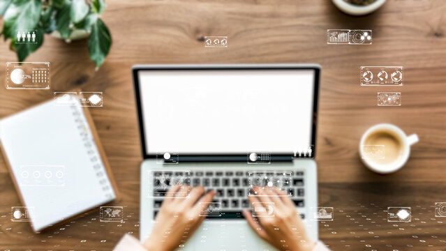Digital data interface on laptop in modern office