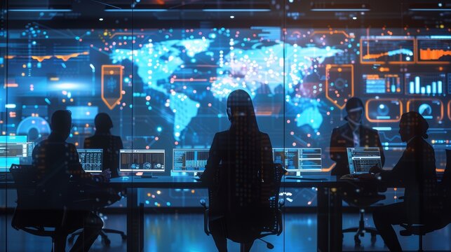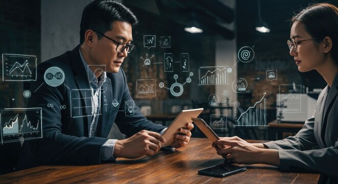 Collaborative Business Strategy Meeting with Advanced Technology Interfaces for Innovative Data Analysis and Productivity Solutions.