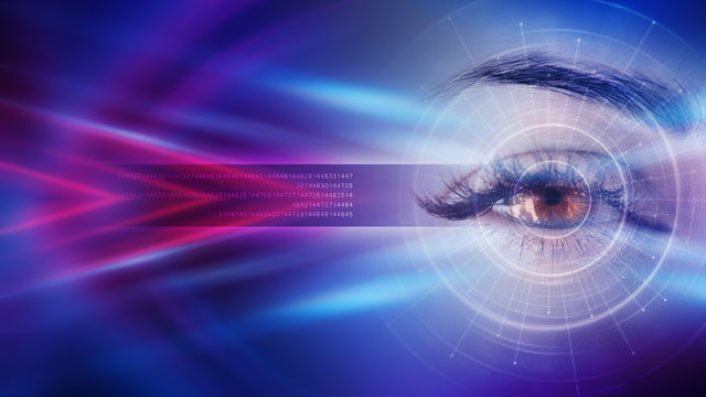 Male eye with futuristic biometric digital interface scanning on blue background showing concept of secure identity and technological vision focus.
