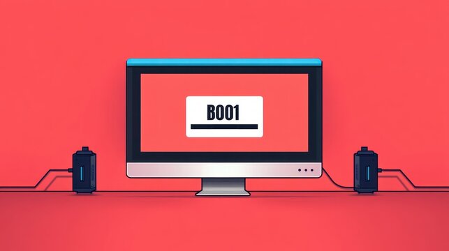 Minimalist illustration of a computer monitor displaying a code or identifier with two connected devices on either side against a vibrant red background
