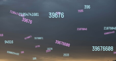 Digital data interfaces overlaying cloudy sky backdrop