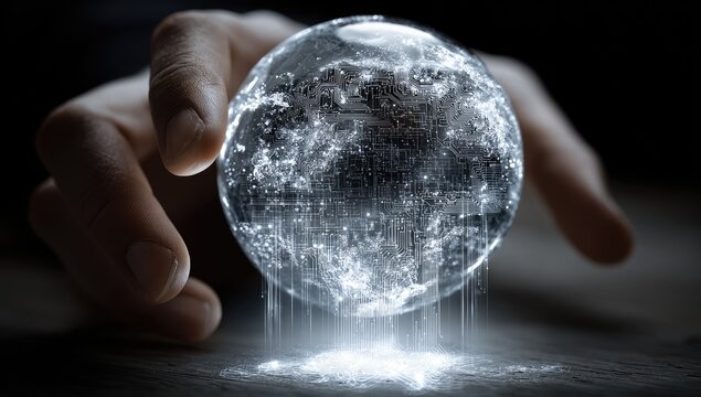 Futuristic Digital Technology Concept with Glowing Holographic Network Globe Over Businessman Hand