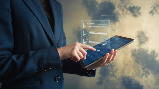 Person in suit using tablet with checklist overlay against a cloudy sky background outdoors