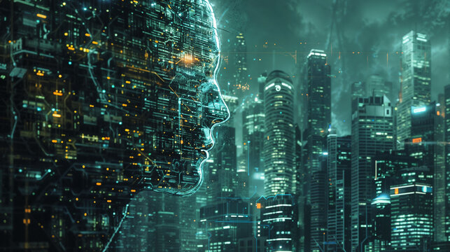 Futuristic cityscape with digital AI human face overlay. Concept of artificial intelligence and smart city technology integration, related to control