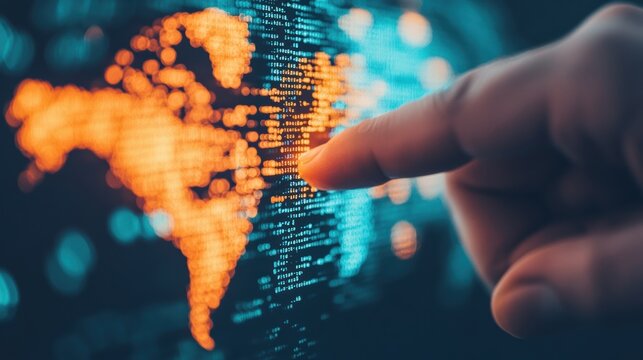 A hand is guiding towards a radiant world map, showcasing bright data points in a modern digital environment