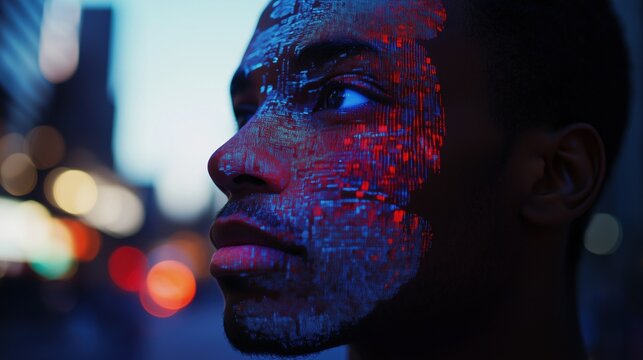 Striking Visual of Digital Hologram on a Man's Face in a Futuristic Cityscape Setting
