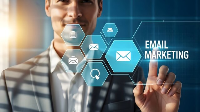Man interacting with artificial intelligence cloud interface and connected network elements on blue background for technology, cloud computing, user interaction, and digital innovation concepts.