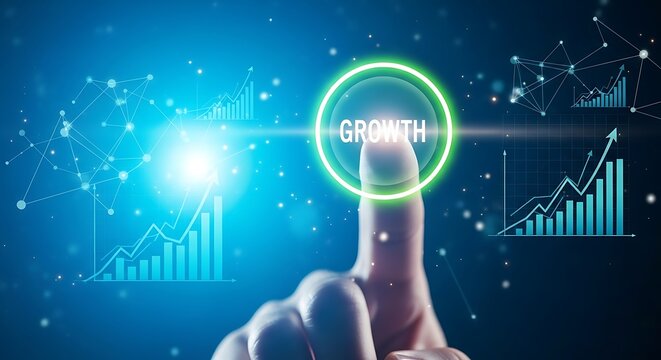 Hand interacting with digital checklist interface over data dashboard on blue background, symbolizing task management and success concept.