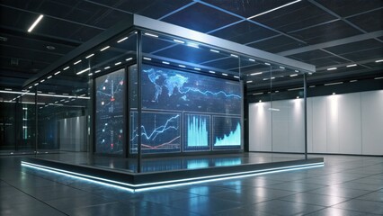 A modern data visualization room featuring digital screens displaying global data and analytics in a sleek, high-tech environment.