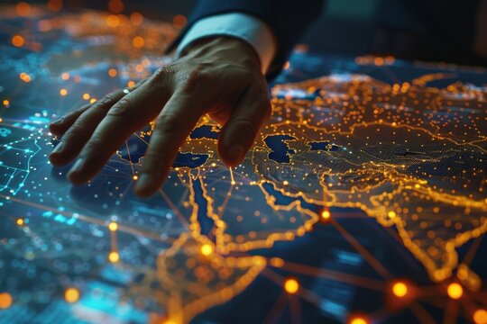 Digital Earth Connection: Hand Touching Global Network over Cityscape