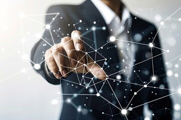 Close-up of a person in a suit interacting with a digital network visualization, their finger appearing to connect nodes in a complex web of data points