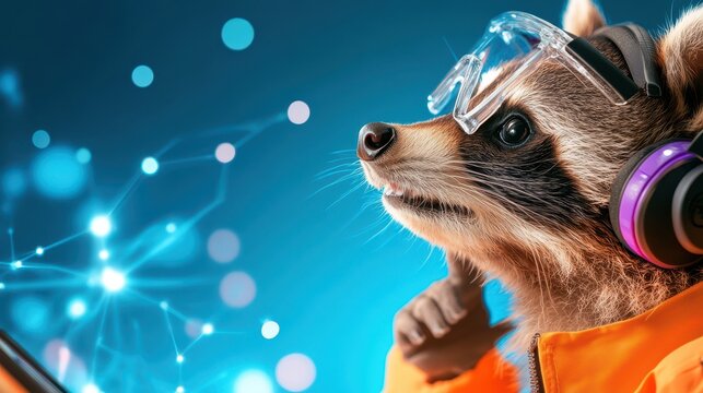 A business professional interacts with a glowing digital tablet, showcasing virtual icons that symbolize technology and connectivity in a modern urban night scene. Tessel