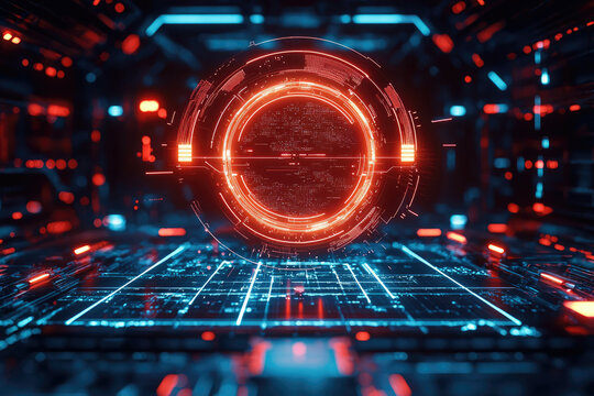 Futuristic digital interface with glowing red and blue circuits, displaying technological data.