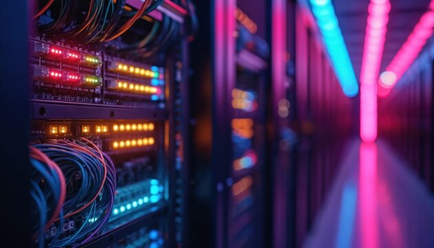 Server racks with electric cables, wires represent fiber optic internet equipment. Data center, tech and network background. Information transfer, digital data storage, efficient telecom.