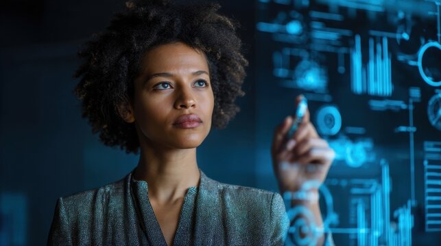 A woman stands in a modern office focused on a digital interface. She uses her finger to navigate through data and charts displayed in front of her.