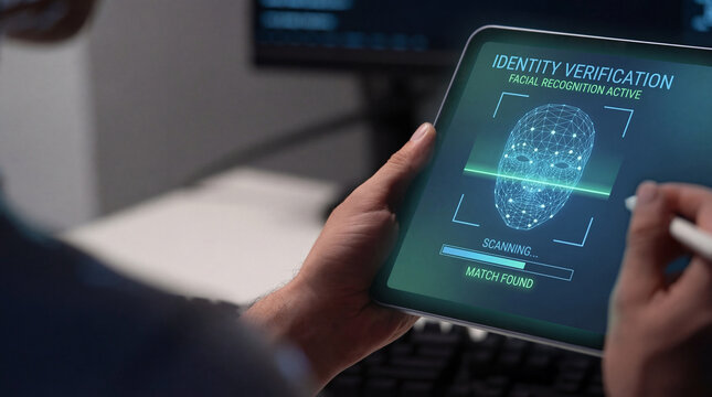 Identity verification facial recognition active scanning match found on tablet screen held by person using stylus in office environment