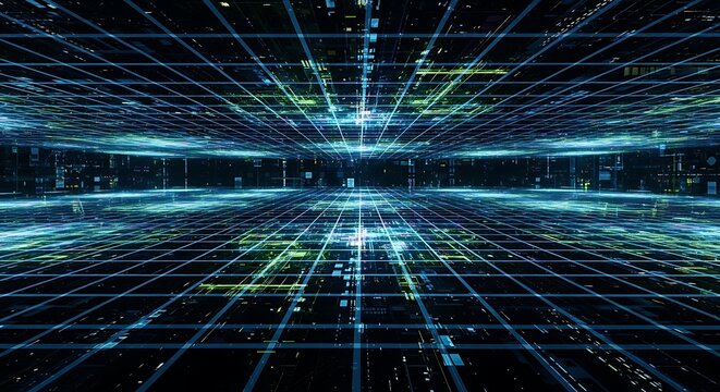 Digital binary code spirals within a futuristic, illuminated circular interface
