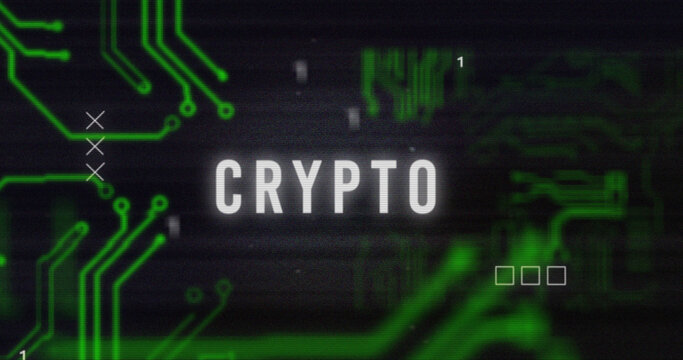 Glitchy circuit board with crypto text overlay