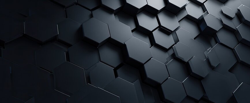An abstract, geometric 3D rendering of dark, overlapping hexagonal shapes. Dramatic lighting