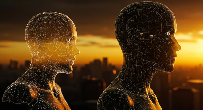 Two glowing wireframe AI humanoids overlooking a futuristic city at sunset, symbolizing technology, consciousness, and the future.