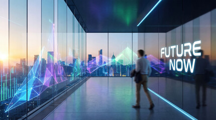 A person walks in a contemporary office overlooking a sprawling cityscape bathed in the golden hues of sunset. Neon lights and digital projections mingle, showcasing FUTURE NOW on the glass.