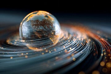 Dynamic visual representation features a digital globe surrounded by swirling streams of glowing particles, creating an abstract and captivating visual concept.