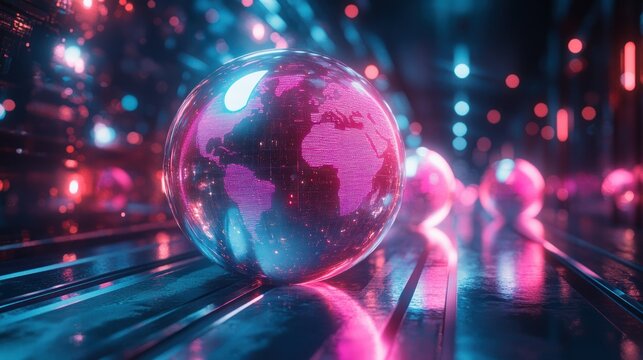 Neon globe Earth surrounded by glowing pink rings, futuristic digital design on dark reflective surface.