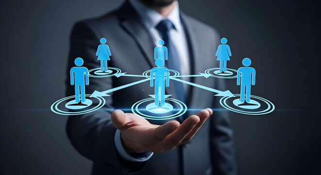 Businessman holding glowing blue digital human icons connected by arrows representing network structure and team management over dark background