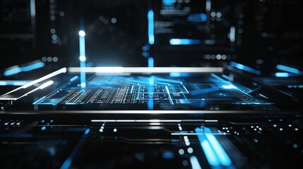A futuristic technological background with blue lights and glowing lines.