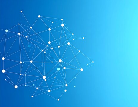 An abstract design featuring a network of connected white dots on a gradient blue background. The lines link, creating a complex pattern
