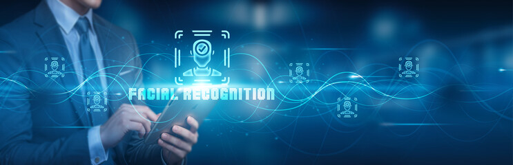 Hand touching with tab, connected by a global network, enabling facial recognition technology. This futuristic advancement spans continents, enhancing security, personalization, and seamless digital
