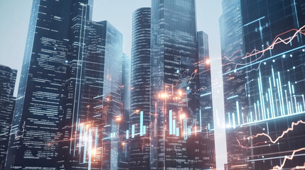 Futuristic financial analytics with urban skyline overlay