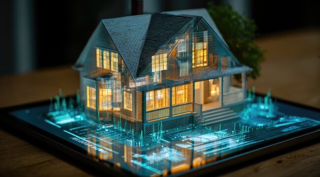 Architect analyzing building model with digital data overlay