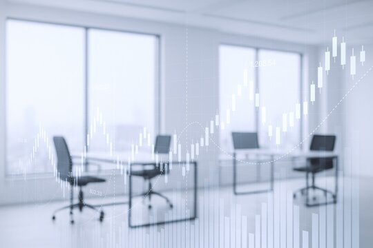 Empty Office Space with Financial Data Overlay, Representing Market Trends and Economic Analysis in a Workplace Setting