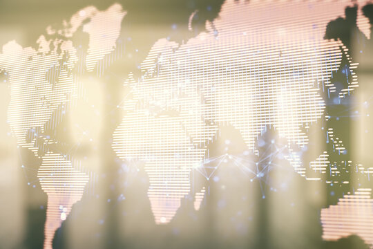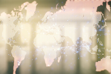 Double exposure of abstract digital world map hologram with connections on a modern furnished office interior background, big data and blockchain concept