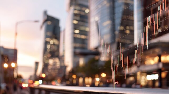 Displaying faint candlestick chart overlay over urban skyline, with graphs, percentages and tickers