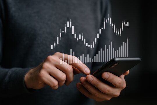 A smartphone displaying a stock market graph with buy and sell indicators overlaying it