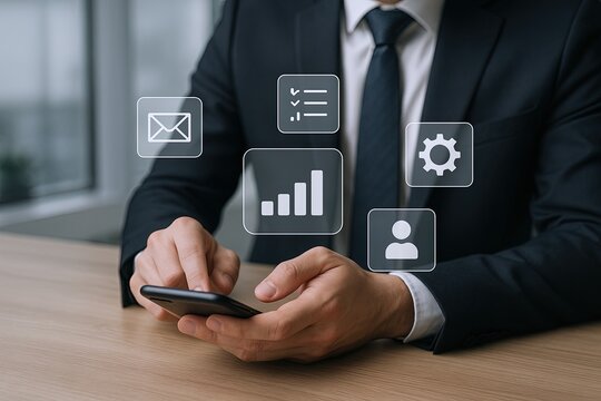 Mobile Marketing Strategy Concept: Businessman Analyzing Business Data on a Smartphone with Icon Overlays