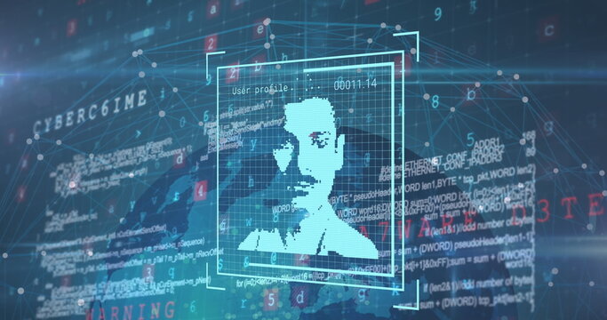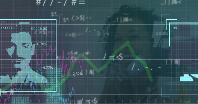 Image of data processing and profile icons floating over time-lapse of people walking at office